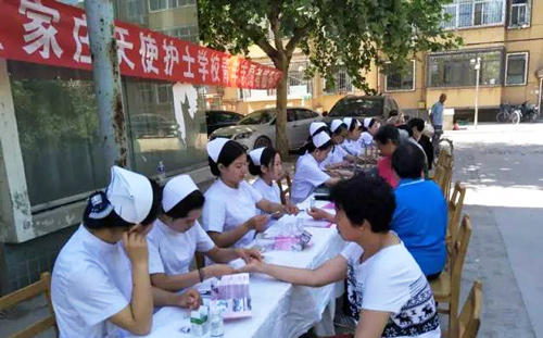 6月8日上午8时,石家庄天使护士学校25名青年志愿者深入到大郭新村社区,开展爱心义诊活动。(下图为活动现场)