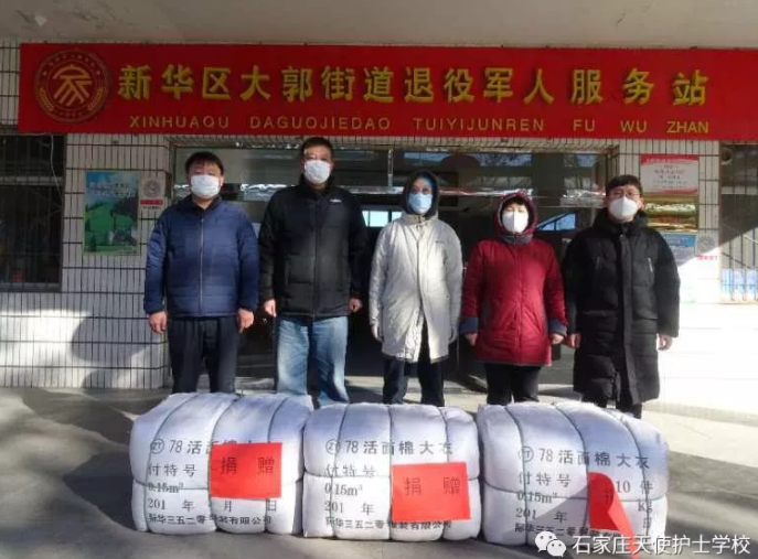 社区担负着组织广大居民群众抗击疫情的重大责任,他们不畏严寒、不顾疲惫,24 小时值守在居民小区出入口,令人十分敬佩。石家庄天使护士学校购买了价值 11000 元的牛奶、香肠、面包、棉大衣等物品,送到了石家庄市新华区大郭街道办事处、鹿泉区上庄镇,通过街道分发到所属社区,以表达天使护校全体员工的爱心和敬意。