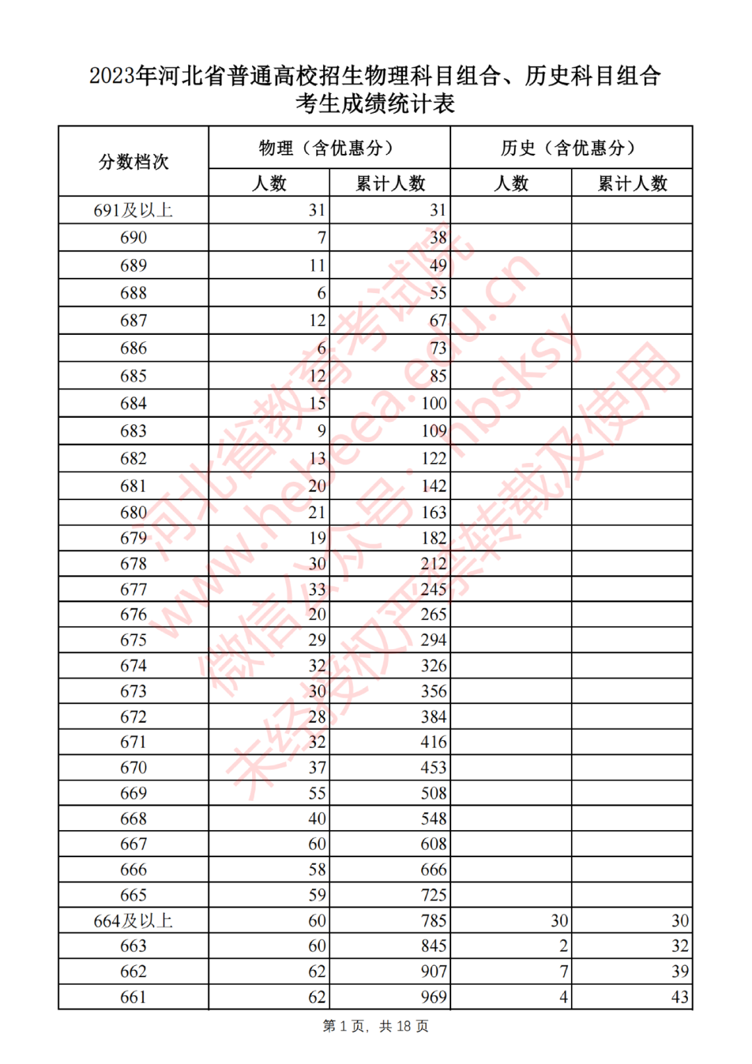 2023年河北省普通高校招生物理科目组合、历史科目组合考生成绩一分一档表