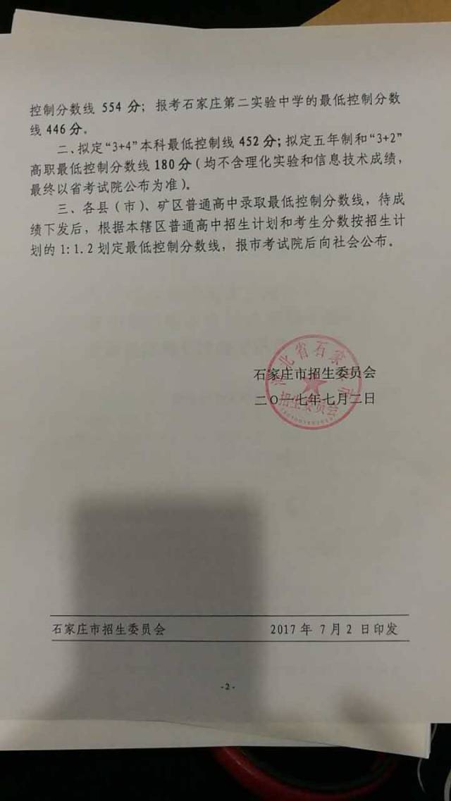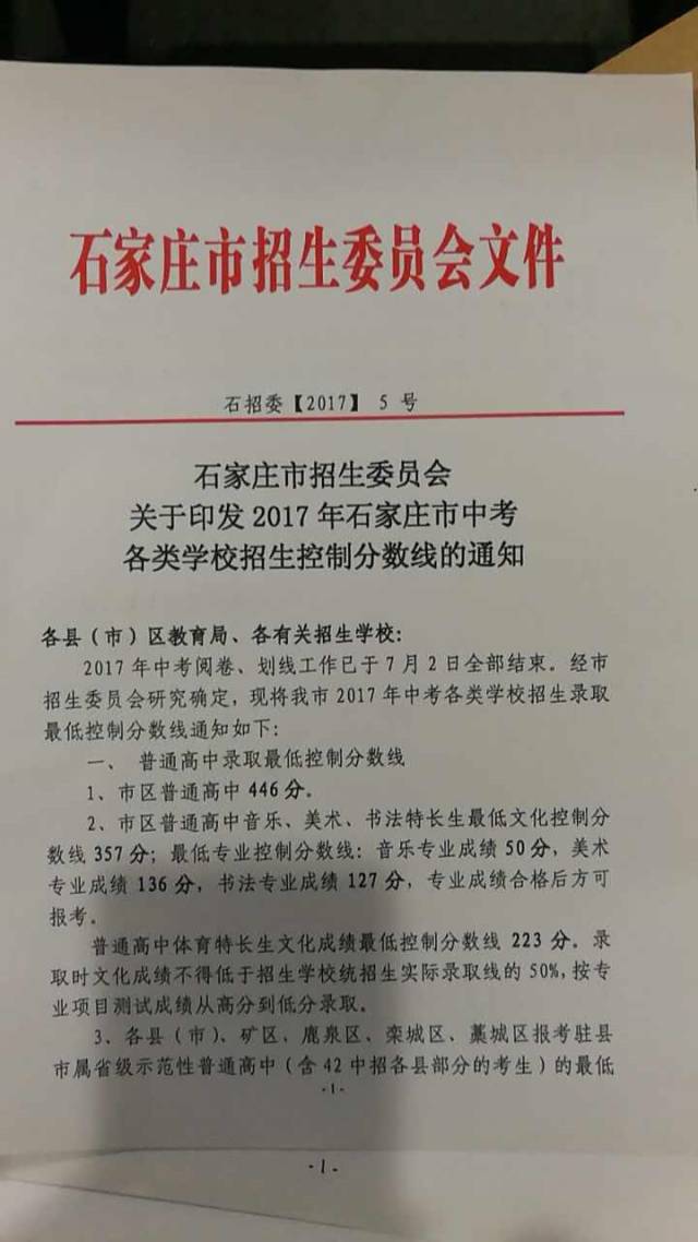 石家庄2017年中考录取分数线