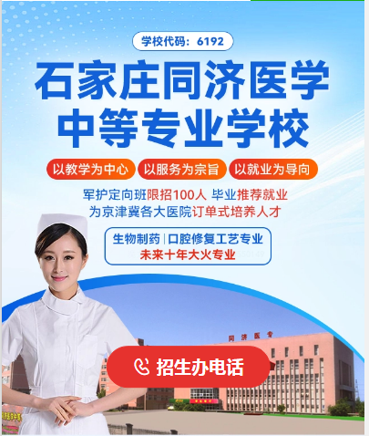 | 石家庄同济医学中等专业学校成立于1989年,是河北省(省属) 全日制医学类院校,学校全方位依托河北省会的教育资源,采取理论结合实际、突出临床操作的教学方法,学生完成规定的课程毕业的同时学院提供固定的实习医院及广阔的就业渠道(报到时签订培养就业协议,毕业时学校负责推荐就业)。学院开设升学班,护理、口腔修复、生物制药、民航运输服务等专业,面向全国招收初中、高中应往届毕业生。招生热线:15833922769 冯老师(同微信) 学校坐落在河北省石家庄,环境优美,各类教学、生活、文体活动设施- -应俱全, 是青年学子求知成才的理想学府。 |
